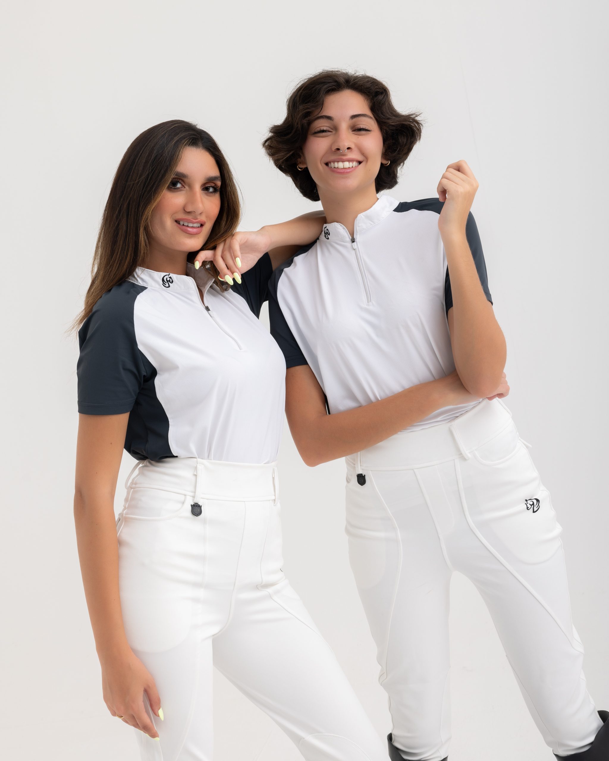 Our tops are thoughtfully crafted to offer both style and functionality. We understand the importance of choosing versatile and comfortable tops that can withstand the demands of riding while looking fashionable. Our tops are made with moisture-wicking fabrics, providing breathability and flexibility, allowing riders to maintain a professional and polished appearance both on and off their horses.